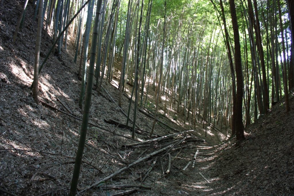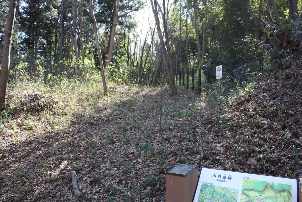 坂をのぼりきったあたりの左手が、家臣の屋敷と言われる「小宮曲輪」です。草が伸び、分かりづらいですが、よく見ると平らな面や土塁がある様子がわかります。