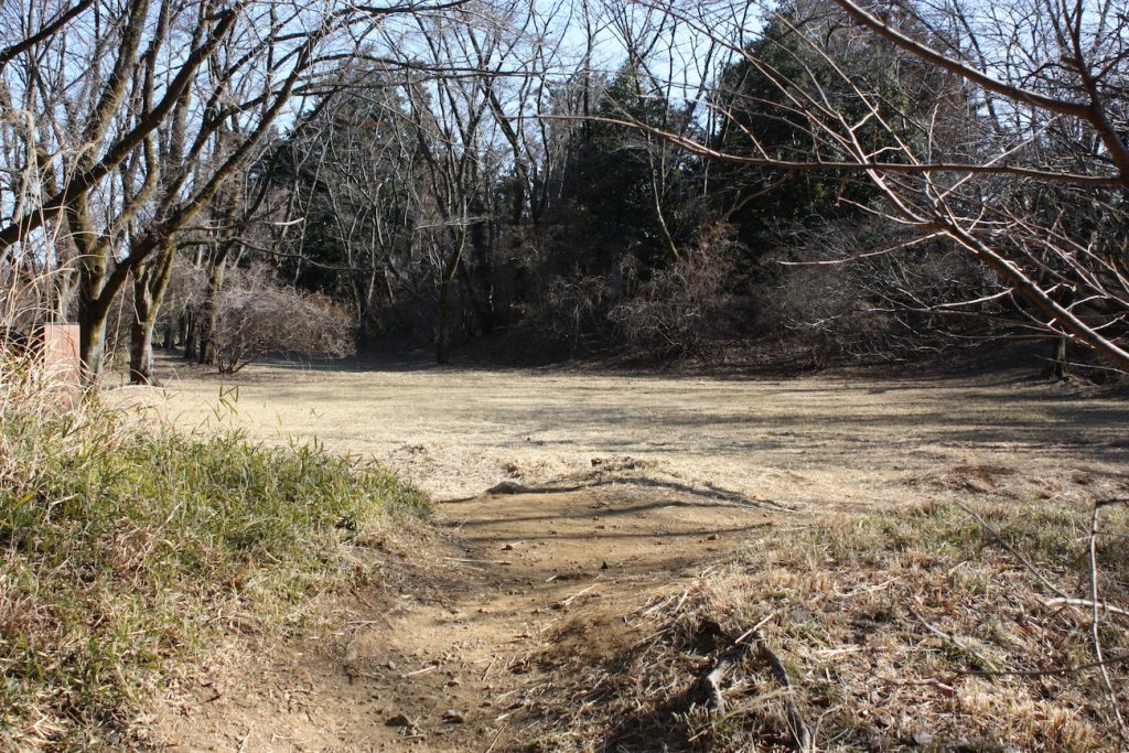 小宮曲輪の道をはさんだ反対側に「三の丸」がありますが、こちらも草むらの中に雰囲気を見ることができます。滝山城では、主要な曲輪は整備されて草刈りなども行われていますが、小さな曲輪などは樹木や笹、草が生えたままのところも多くあります。そのようなところもよく見ると、平たく削られた跡や土塁などを見つけることもできます。そのようなところを見るには、冬場の草が多く枯れる季節がいいと、一般的に言われています。山城の攻城は、冬季がいいようです。