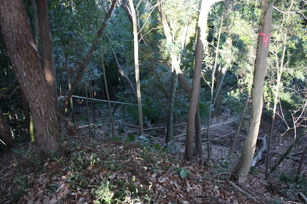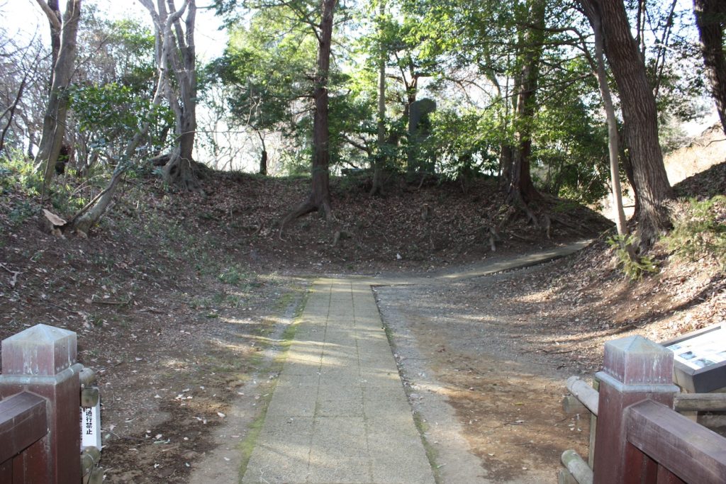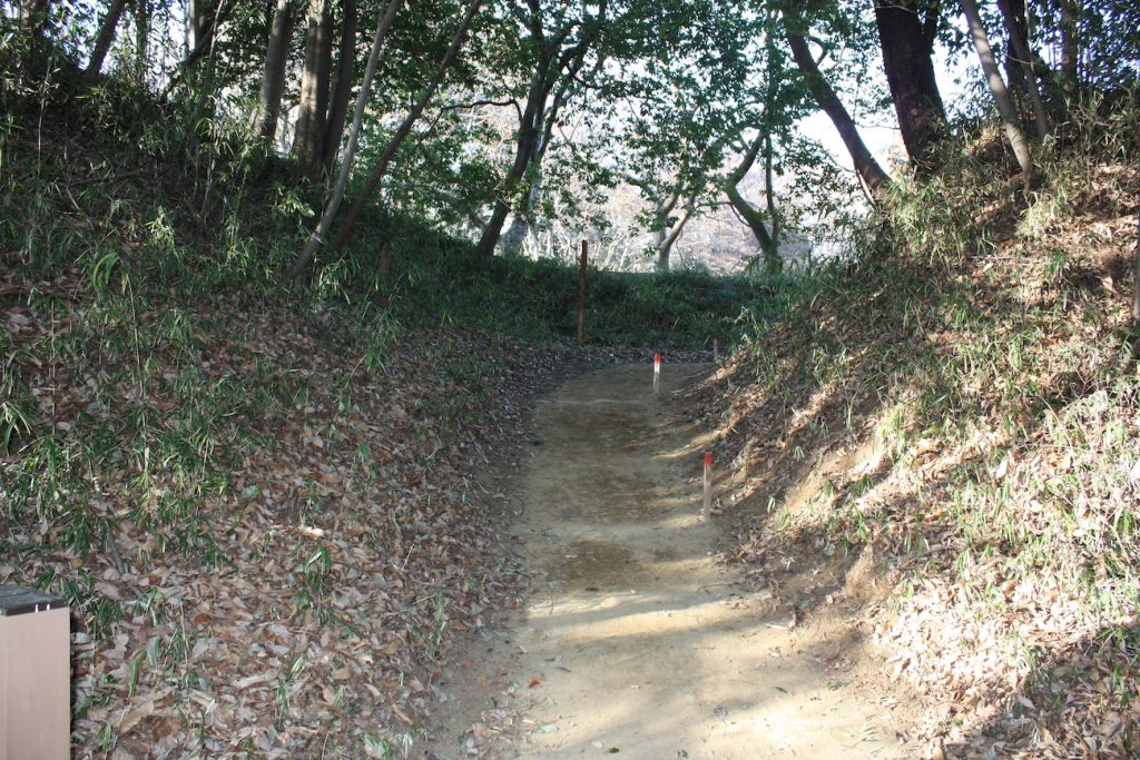 本丸と中の丸の間の堀をそのまま降りていくと、ふもとの多摩川べりの運動場まで出ることができます。そこにたどり着くまでの急坂が続く様子から、城の北側が急峻な崖で形成されており、攻めづらい地形であることが改めて確認できます。降りきってしまうと、もう一度のぼるのが嫌になってしまうほどです。