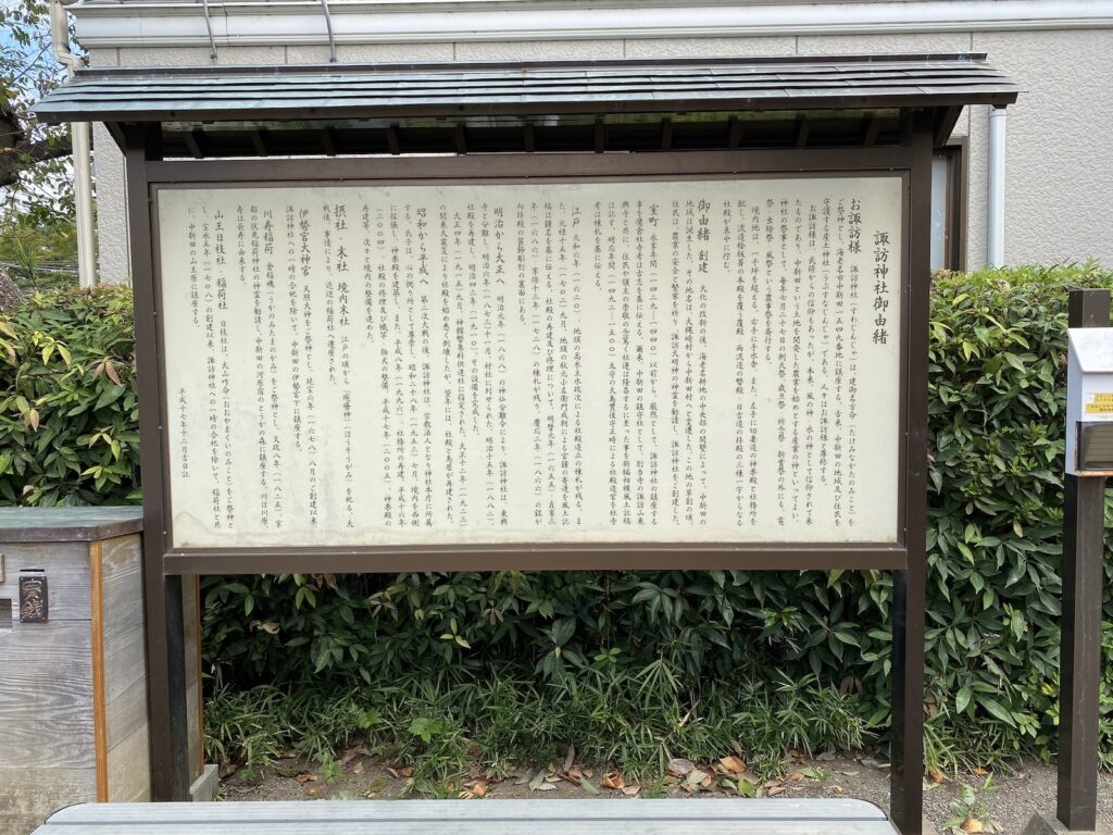 境内にある由緒書きには、大化の改新後の開墾によって中新田の地域が誕生し、この地の草創のころ、諏訪神社が創建されたとあります。そして、「元和6(1620)年、地頭の高木主水政次による社殿建立の棟札が残る」と記され、清秀の子正次の名前が見られます。